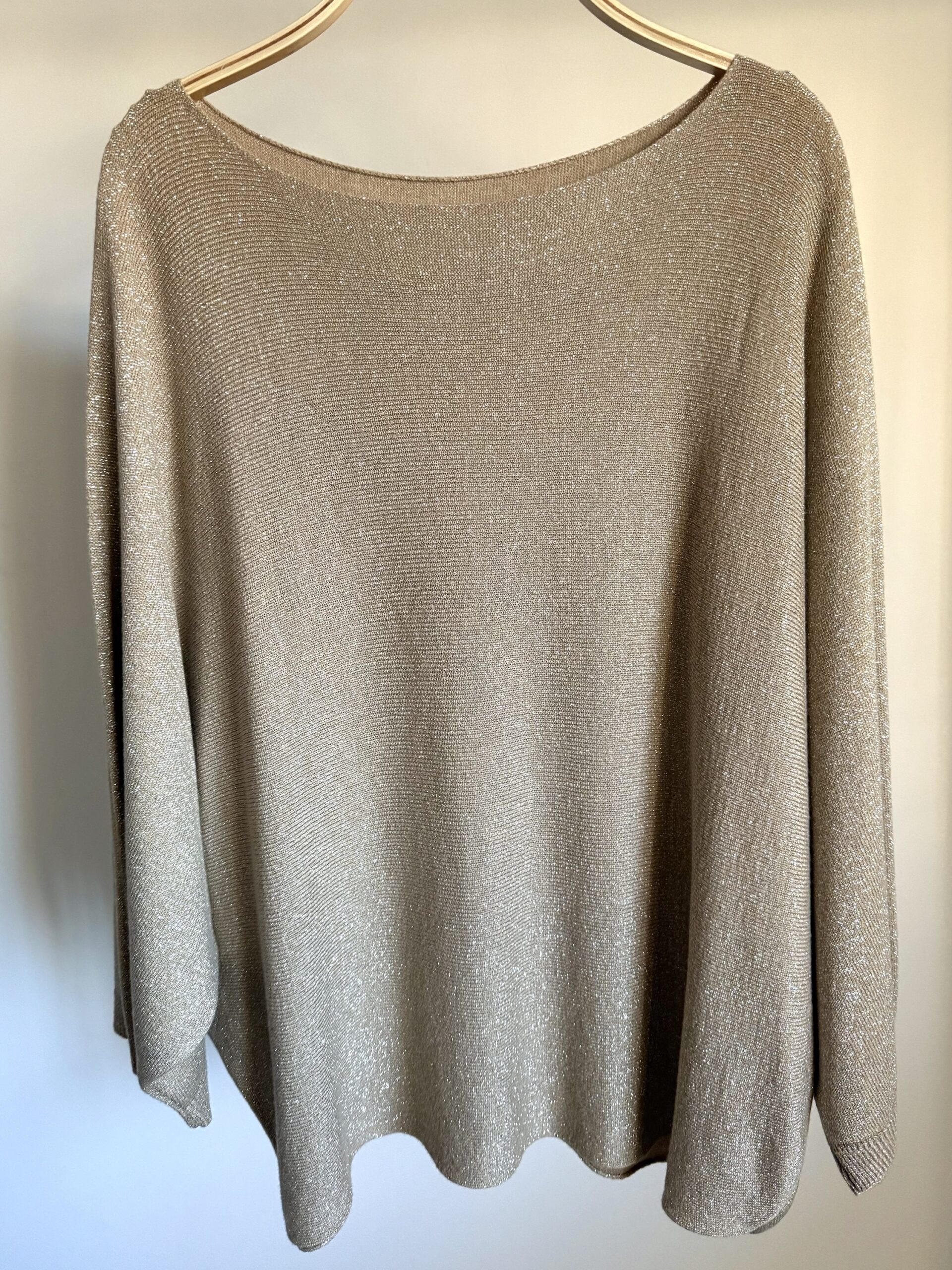 Sweater italiano tejido en hilo con lurex, liviano y con un brillo sutil. Ideal para eventos nocturnos o para elevar un look básico con elegancia. De calce oversized y talle único.